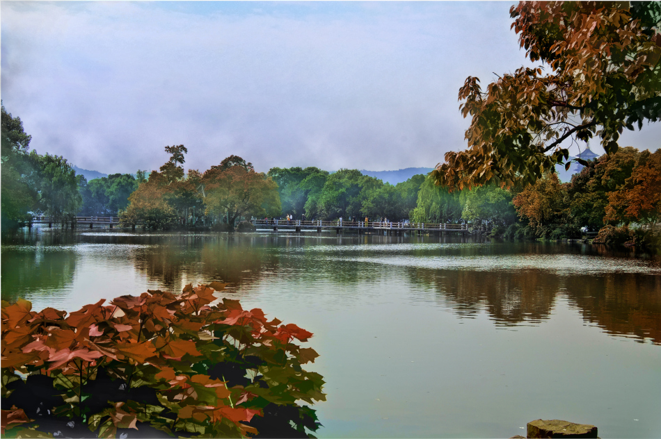 Penasaran berawal dari sini. Di depan kita adalah hamparan air tenang, di tepian danau Xi Hu yang luas. Seperti kolam raksasa, kira-kira seluas dua-tiga lapangan sepak bola. Samping kiri kanan, pepohonan besar yang serba gelap. Di depan jauh ada jembatan di atasnya ada bangunan seperti joglo, bangunan tradisional China yang ujungnya selalu melengkung. Layer yang lebih jauh di balik jembatan itu adalah Danau Xi Hu dan paling jauh di ujung sana background gunung, yang topi atasnya berhias lampu-lampu keemasan. Mirip bukit emas yang ujung atasnya memantulkan kerlip cahaya.