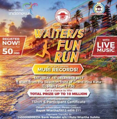 KUTA – Pemerintah Kabupaten Badung melalui Dinas Pariwisata dan Lembaga Pemberdayaan Masyarakat (LPM) Kuta menyatakan dukungan penuh terkait penyelenggaraan Waiter/Tray Fun Run yang rencananya akan memecahkan rekor MURI 1000 peserta yang akan diadakan Sabtu (16/12) di Pantai Kuta. Event yang digelar oleh Food and Beverage Executive Association (IFBEC) Bali ini juga sekaligus menjadi ajang kamapnye Bali is Safe sebagai bentuk promosi pariwisata Bali.