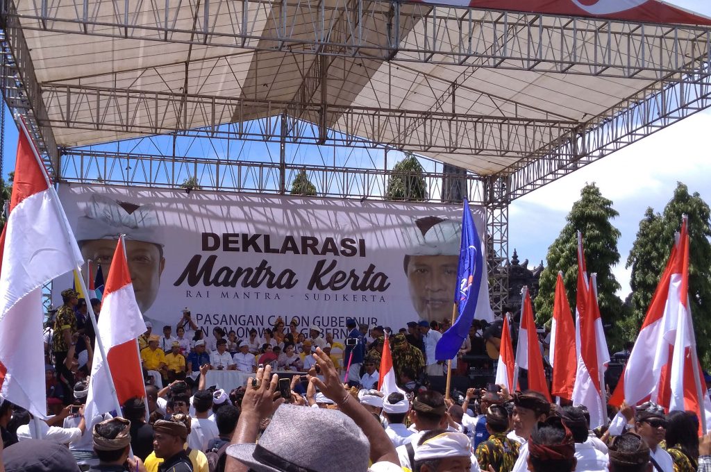 DENPASAR – Pasangan calon Gubernur dan calon Wakil Gubernur Bali Rai Mantra – Ketut Sudikerta menyampaikan orasi politik mereka sebelum mendaftar ke Komisi Pemilihan Umum Daerah (KPUD) Bali dengan memaparkan visi dan misi untuk membangun Bali yang diberi nama Nawa Candra. Salah satu isi Nawa Chandra yakni menolak reklamasi Teluk Benoa yang menuai pro-kontra di masyarakat.