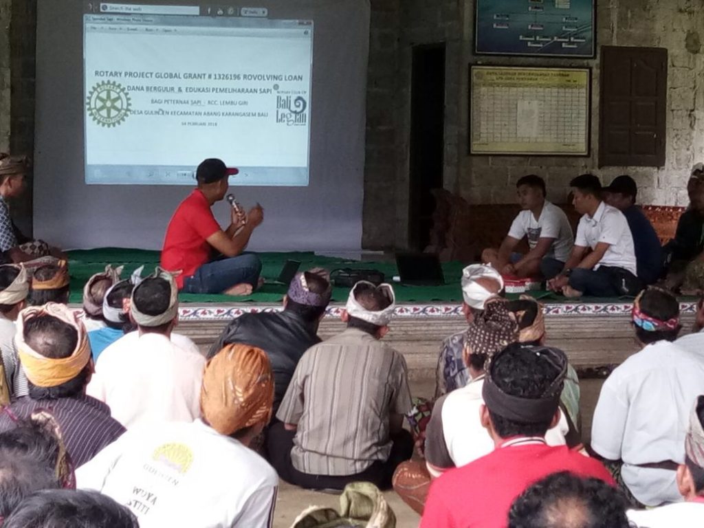 AMLAPURA – Rotary Club Legian kembali menggelar kegiatan sosial dalam bentuk dana bergulir yang kali ini menargetkan memberi bantuan untuk peternak sapi di Kabupaten Karangasem. Acara serah terima dana bergulir yang jumlahnya mencapai Rp.350.000.000 ini diadakan pada hari Minggu, 4 Pebruari 2018 di wantilan pura Desa Gulinten, Kecamatan Abang, Karangasem.