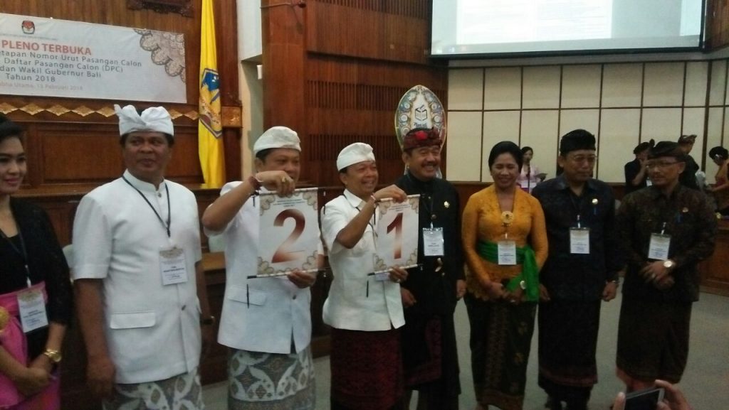 DENPASAR – Pasangan Calon (paslon) dari dua kubu yakni Ida Bagus Rai Dharmawijaya Mantra-Ketut Sudikerta (Mantra-Kerta) dan Wayan Koster-Tjokorda Oka Artha Ardhana Sukawati (Koster-Ace) memastikan nomer urut masing-masing untuk pencoblosan setelah mengikuti Pengundian Nomor Urut Pasangan Calon Gubernur dan Wakil Gubernur Pilgub Bali 2018 yang dilaksanakan oleh KPU Bali di Gedung Wiswasabha, Denpasar, Selasa (13/2/2018).