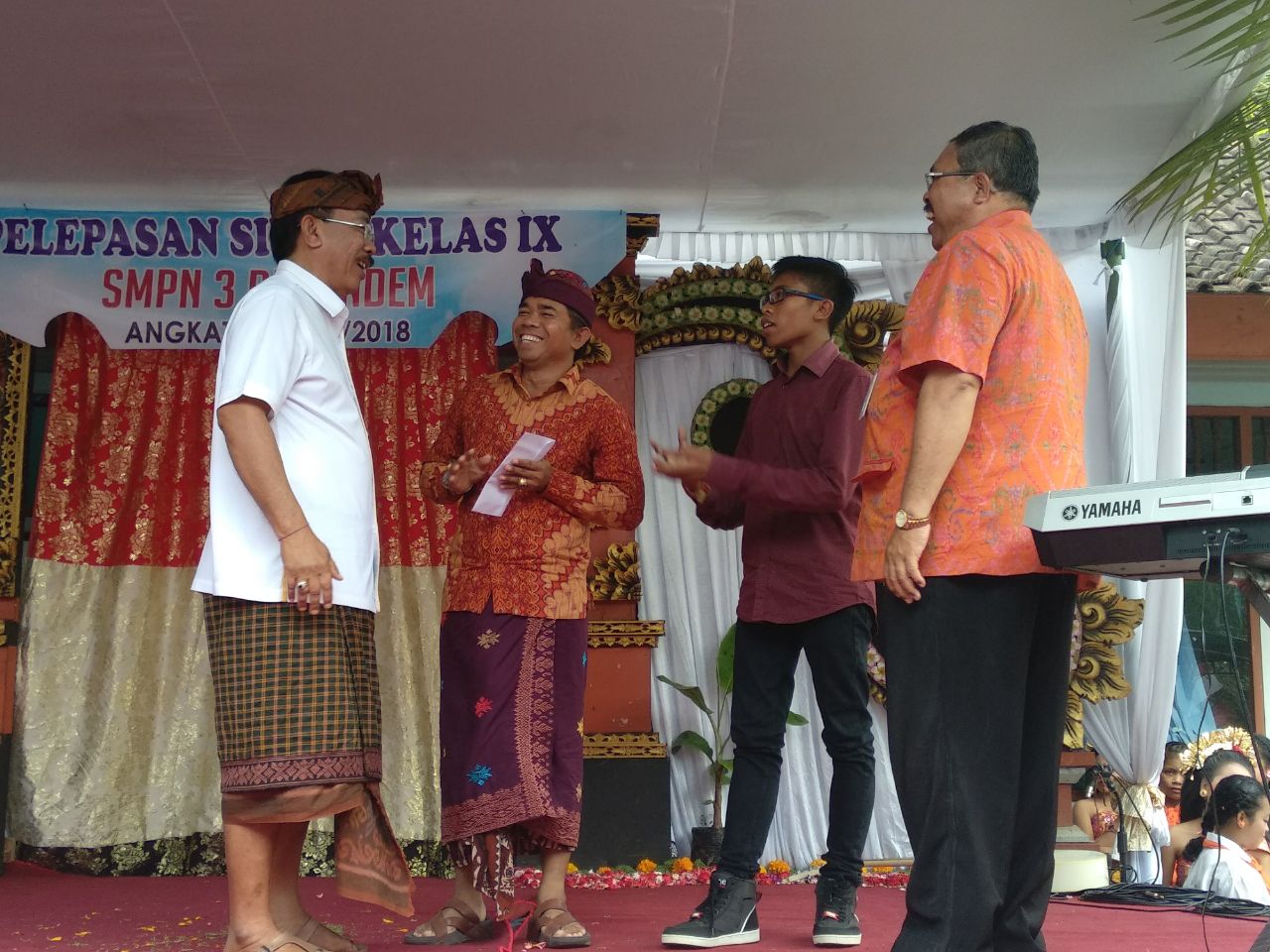 Kepala Sekolah SMP Negeri 3 Bebandem Wayan Jati mengucapkan terima kasih kepada semua pihak yang telah hadir, seraya memberi apresiasi yang tinggi terhadap Wayan Artaya selaku alumni yang menggagas acara ini dapat terlaksana.