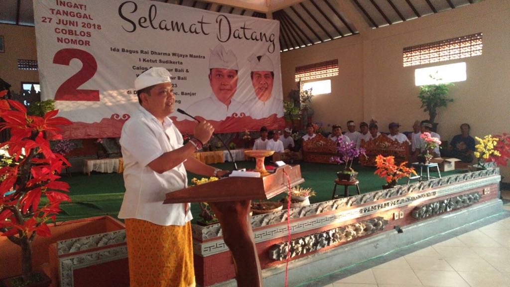 DENPASAR – Calon Gubernur (Cagub) Bali nomor urut 2 yang diusung Koalisi Rakyat Bali (KRB) Ida Bagus Rai Dharmawijaya Mantra menggelar kampanye dialogis di Desa Banjar, Kecamatan Banjar, Kabupaten Buleleng Bali. Sekalipun kampanye dialogis digelar di Desa Banjar, namun peserta kampanye bukan hanya berasal dari warga Desa Banjar. Massa yang hadir sekitar 2 ribu orang tersebut juga berasal dari Desa Sidatapa, Desa Cempaga, Desa Tigawasa, Desa Pedawe dan Desa Banyuseri. Pusat kampanye digelar di Balai Dusun Melanting. Sejak paginya, warga dari beberapa desa di Kecamatan Banjar antusias mendatangi lokasi. Sepanjang perjalanan ratusan warga meneriakan yel-yel Mantra-Kerta dengan mengacungkan salam dua jari. Dalam kampanye dialogis tersebut, Rai Mantra didampingi oleh politisi senior Partai Golkar Nyoman Sugawa Korry, para anggota Tim KRB Kabupaten Buleleng dan Provinsi Bali, relawan Mantra-Kerta dan para simpatisan lainnya. Selain itu hadir juga kelompok-kelompok masyarakat, perwakilah dadya, perwakilan subak dalam menyambut Rai Mantra.