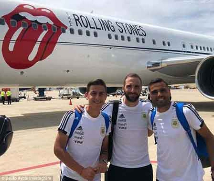 Sebelum bertolak ke Piala Dunia 2018 beberapa pemain timnas Argentina mencoba mengabadikan momen dengan berfoto di samping pesawat grup band yang terkenal dengan logo bibir dan lidah berwarna merah itu.