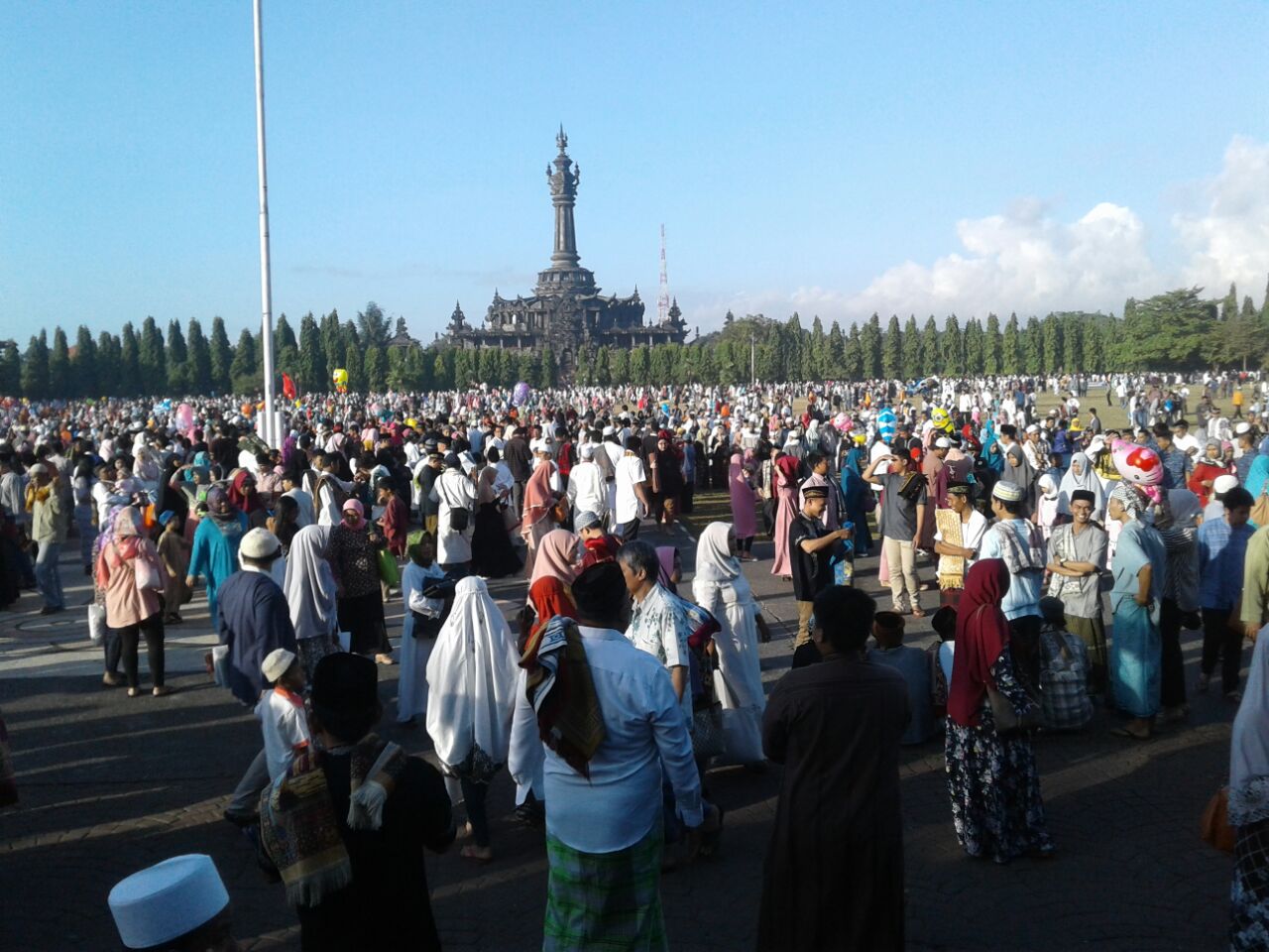 DENPASAR, theeast.co.id – Ribuan umat muslim Kota Denpasar menggelar sholat Idul Fitri yang berpusat di Lapangan Puputan Renon Denpasar, Jumat (15/6). Sejak pukul 06.00 Wita, ribuan umat muslim mulai membanjiri Lapangan Renon Denpasar untuk menggelar sholat bersama. Akibatnya, beberapa ruas jalan yang menuju Lapangan Renon mengalami kemacetan panjang. Ratusan aparat kepolisian melakukan pengamanan ekstra ketat terhadap pelaksanaan sholat idul fitri bersama dari ribuan umat muslim yang ada.