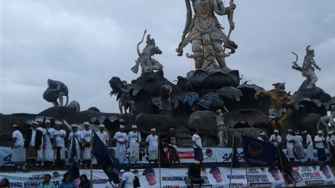 DENPASAR, theeast.co.id – Ratusan Saksi Semesta didaklarasikan oleh Partai Nasdem Bali bertempat Taman Patung Titi Banda, Kecamatan Denpasar Timur, Kota Denpasar, Kamis (21/6). Di Taman Patung Epos Ramayana ini, ribuan saksi semesta yang datang dari berbagai penjuru Bali dideklarasikan. Deklarasi dipimpin langsung oleh Ketua DPW Partai Nasdem Bali Ida Bagus Oka Gunastawa, dihadiri para pengurus inti DPW Nasdem Bali, DPD Nasdem dari berbagai kabupaten dan kota di Bali, para simpatisan dan ribuan saksi lainnya. Dalam deklarasi tersebut, ribuan saksi yang sudah dilatih selama ini diajak untuk mendokumentasikan semua kegiatan TPS dengan menggunakan HP kemudian di-upload ke media sosial melalui facebook dan WA Group. Setelah menyanyikan lagu Indonesia Raya di atas patung Titi Banda, seluruh saksi diminta untuk mengangkat HP masing-masing setinggi-tingginya, sebagai simbol yang akan merekam seluruh proses di TPS, kecuali berada di bilik suara.