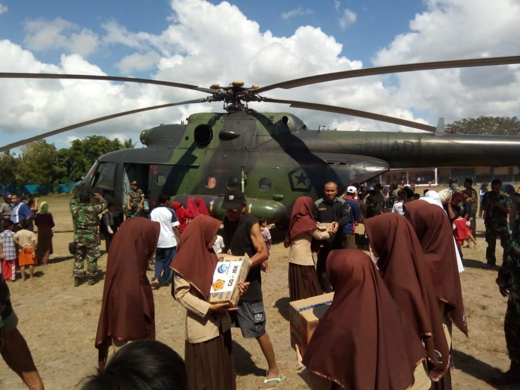Kemudian di Bandara Seleparang juga telah tiba bantuan dari Mabes TNI yang dikawal langsung oleh Kolonel Inf Farid Makruf, Paban V Bhakti TNI Ster TNI, yang juga sebagai mantan Danrem 162/Wira Bhakti, membawa bantuan lewat udara dengan menggunakan Heli TNI AD H 5140/Mi 17 dan begitu bantuan tiba langsung diangkut oleh anggota Kodim bersama warga masyarakat dan anak-anak pelajar untuk dinaikan kedalam kendaraan yang telah disiapkan di GOR Selaparang oleh Pemda Kabupaten Lombok Timur untuk diangkut dan didistribusikan melalui Posko Penanggulangan Bencana Kabupaten Lombok Timur, adapun jenis bantuan tersebut berupa natura antara lain, beras, roti, air mineral, mie instan, minyak goreng dan pakaian yang sangat dibutuhkan oleh warga masyarakat yang menjadi korban gempa.