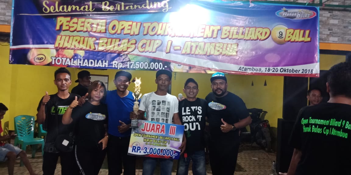 Selain itu dalam kelas pemula lokal turnamen Billiar 9 ball Huruk Bulas Cup I Atambua, juara I diraih Godifridus Kono, juara II Jefri Nggeolima, juara III