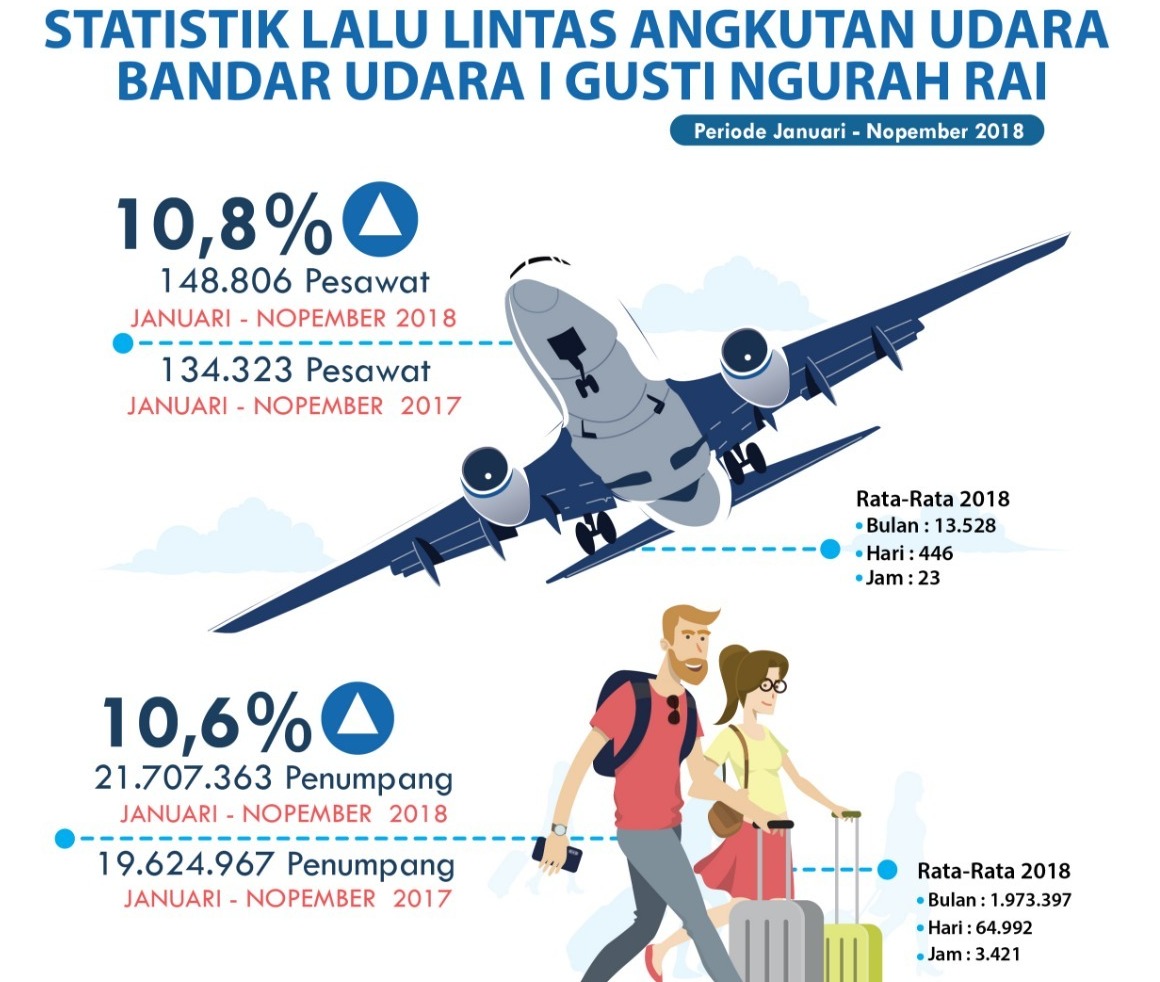 Berdasar pada data statistik Lalu Lintas Angkutan Udara (LLAU) periode Januari – November 2018, Bandar Udara Internasional I Gusti Ngurah Rai mencatat telah melayani 21,7 juta penumpang sebagai pengguna jasa Bandar Udara dalam 148.806 pesawat udara. Angka tersebut menunjukkan kenaikan yang signifikan dari angka statistik pada periode yang sama di tahun 2017 lalu. Hingga November 2018, jumlah total penumpang yang dilayani adalah sebanyak 21.707.363 jiwa, dengan persentase peningkatan jumlah penumpang sebesar 10,6% jika dikomparasi dengan statistik tahun lalu.