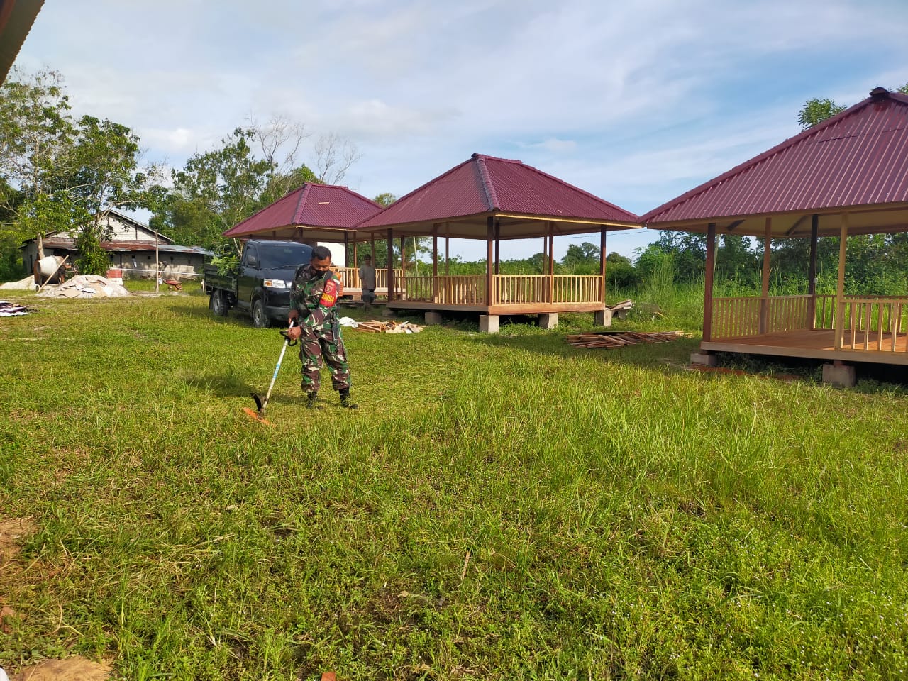 Babinsa Koramil 0913-01/Penajam Kodim 0913/PPU Serda Herry selain giat Komsos (Komunikasi Sosial) dengan warga binaannya juga ikut serta dalam membantu proses pembangunan pendopo tersebut melalui pembersihan pekarangan sekitar pendopo dengan cara mengunakan mesin rumput yang sudah disediakan oleh pihak yayasan.