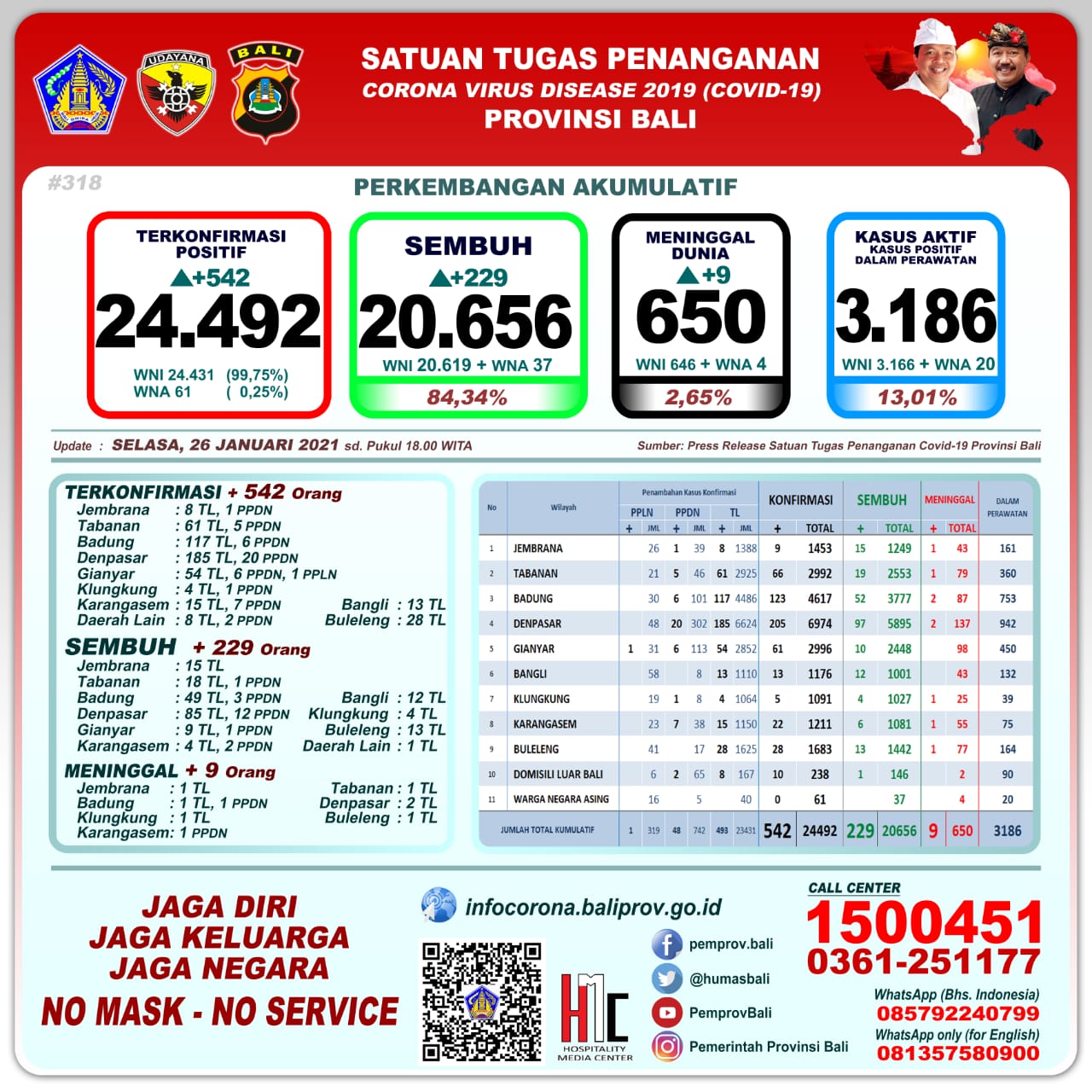 Perkembangan Pandemi Covid-19 di Provinsi Bali per hari ini mencatat pertambahan kasus : TERKONFIRMASI sebanyak 542 orang (493 orang melalui Transmisi Lokal, 48 PPDN dan 1 PPLN) SEMBUH sebanyak 229 orang, dan 9 orang Meninggal Dunia.
