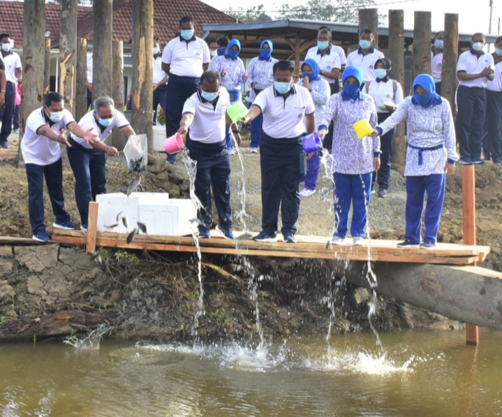 SORONG, The East Indonesia – Panglima Komando Armada (Pangkoarmada) III, Laksamana Muda TNI Dadi Hartanto, M.Tr., (Han)., didampingi Ketua Daerah Jalasenastri Armada III Ny. Bertiana Dadi Hartanto menabur 250 kg benih ikan nila dan mujair di Kolam Laguna Arafuru, Mako Koarmada III Jl. Yos Sudarso Katapop, Distrik Salawati, Kab. Sorong, Papua Barat, Jumat (12/2/2021).