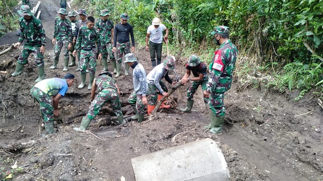 JEMBRANA, The East Indonesia – Setelah pengerjaan rabat beton jalan mencapai 70 persen, Satgas TMMD Ke 110 Kodim 1617/Jembrana bersama warga mulai mengerjakan pembuatan gorong-gorong saluran air. Pembuatan gorong-gorong tersebut merupakan salah satu program tambahan dari sasaran utama rabat beton jalan sepanjang 1.372 meter pada sasaran fisik TMMD kali ini.