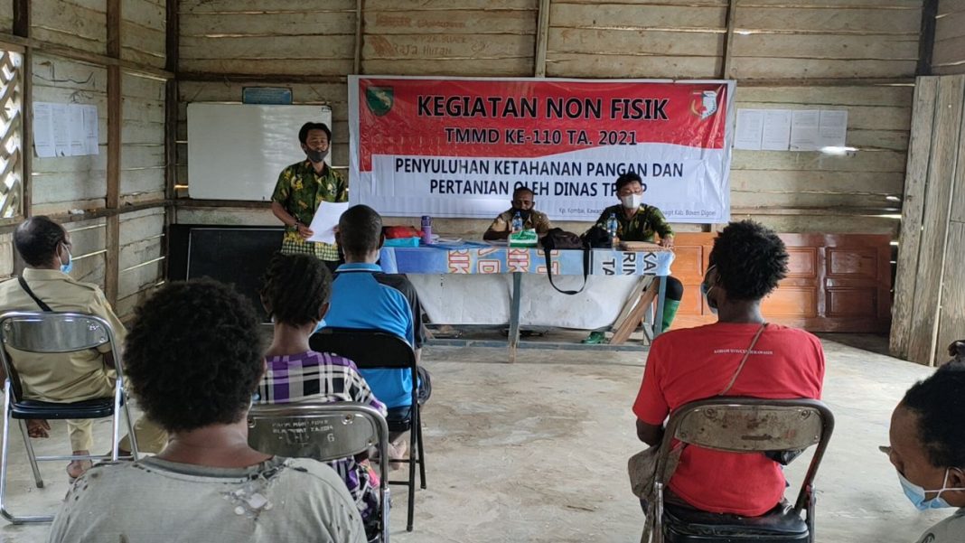 BOVEN DIGOEL, The East Indonesia – Bertempat dibalai Kampung Kombay, Distrik Kawagit, Kab. Boven Digoel. Satgas TMMD ke-110 Kodim 1711/BVD gandeng dinas TPHPP, sosialisasikan penyuluhan ketahanan pangan dan pertanian, Kamis (18/03/2021).