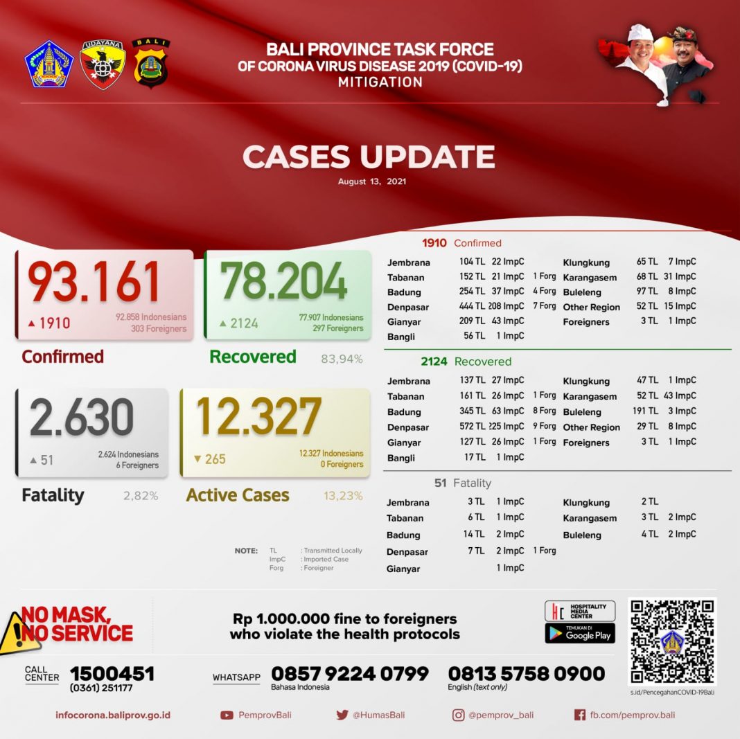 Pertambahan kasus hari ini sebagai berikut : TERKONFIRMASI sebanyak 1.910 orang (1.504 orang melalui Transmisi Lokal, 394 PPDN dan 12 PPLN), SEMBUH sebanyak 2.124 orang dan 51 pasien meninggal dunia.