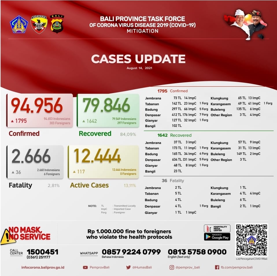 Jumlah kasus secara kumulatif sebagai berikut : TERKONFIRMASI 94.956 orang, SEMBUH 79.846 orang (84,09%), dan Meninggal Dunia 2.666 orang (2,81%). Kasus Aktif per hari ini menjadi 12.444 orang (13,11%).