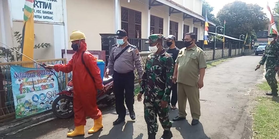 BATANG, The East Indonesia – Jajaran Kepolisian sektor (Polsek) Bandar bersama Koramil Bandar dan Pemerintah Desa (Pemdes) Binangun, melakukan kegiatan penyemprotan disinfektan. Adapun sasaran penyemprotan meliputi rumah warga, fasilitas umum seperti Balai Desa, Musala, Sekolah.