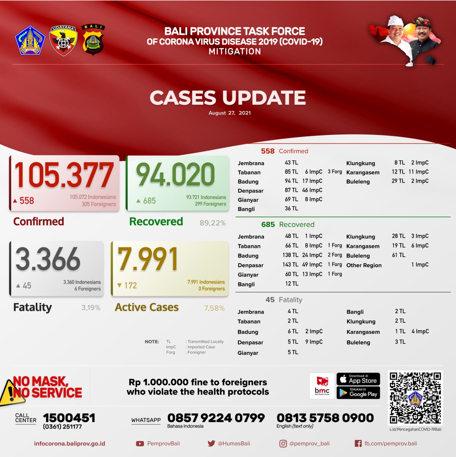 Pertambahan kasus hari ini sebagai berikut : TERKONFIRMASI sebanyak 558 orang (463 orang melalui Transmisi Lokal, 92 PPDN dan 3 PPLN), SEMBUH sebanyak 685 orang dan 45 pasien meninggal dunia.