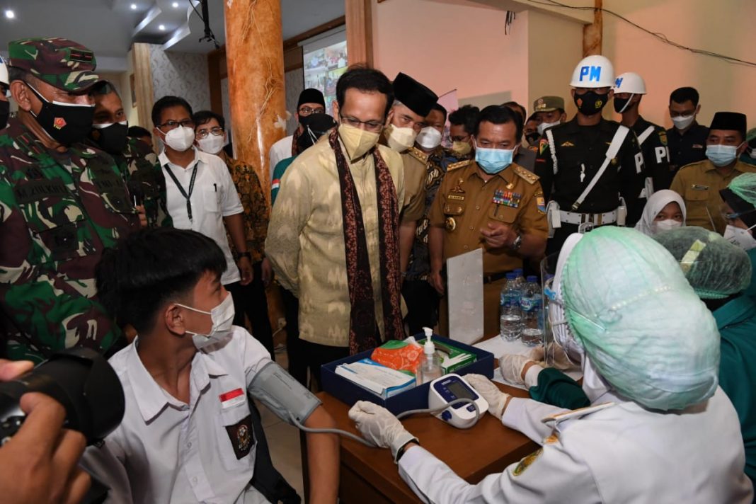 “Selamat, ya, sudah divaksinasi. Semoga bisa segera melakukan pembelajaran tatap muka (PTM) terbatas,” katanya saat berdiskusi dengan salah satu peserta vaksinasi.