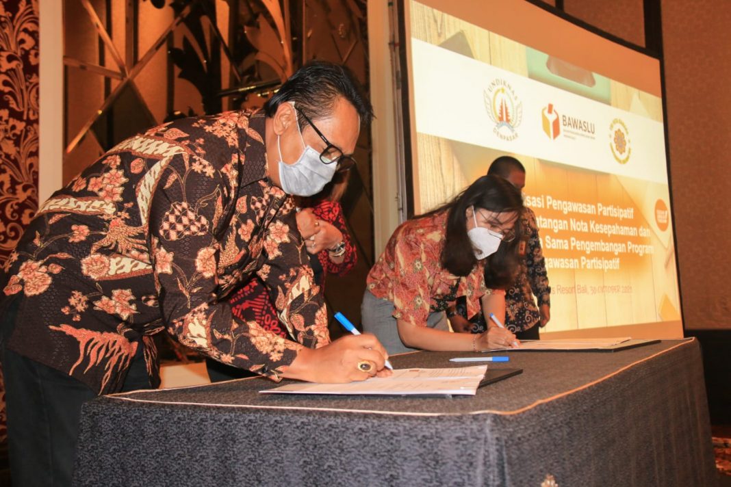 DENPASAR, The East Indonesia – Bawaslu Bali menggandeng dua kampus sekaligus untuk mengembangkan pengawasan partisipatif. Pengembangan ini sebagai perwujudan salah satu misi Bawaslu, yaitu meningkatkan keterlibatan masyarakat serta sinergi kelembagaan dalam pengawasan pemilu partisipatif. Bawaslu Bali menggelar sosialisasi pengawasan partisipatif serta penandatanganan nota kesepahaman dan perjanjian kerjasama pengembangan program pengawasan partisipatif, Sabtu (30/10/2021).