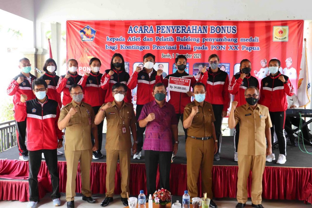 SINGARAJA, The East Indonesia – Wakil Bupati Buleleng, dr. I Nyoman Sutjidra, Sp.OG memberikan bonus kepada pelatih dan atlet Buleleng yang telah mengharumkan nama Buleleng dalam event bergengsi PON XX Papua Tahun 2021 beberapa waktu lalu. Bonus ini diberikan sebagai bentuk apresisasi dan motivasi seluruh atlet Buleleng untuk lebih semangat dalam berlatih dan berjuang pada kejuaraan lainnya. Hal ini terungkap dalam acara Pemberian Bonus Atlet dan Pelatih Buleleng pada PON XX Papua, Senin, (1/11), di Ranggon Sunset.