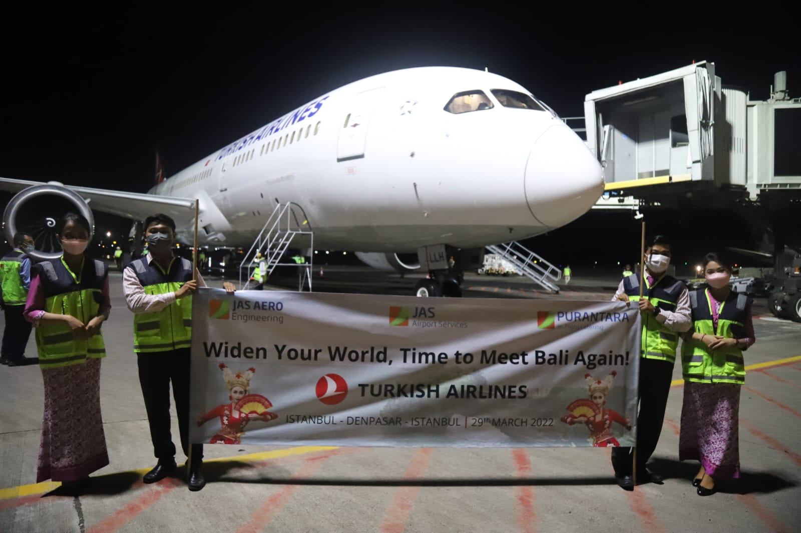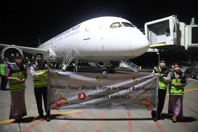 DENPASAR, The East Indonesia – Turkish Airlines berhasil melakukan pendaratan perdana di Bandara Internasional I Gusti Ngurah Rai Bali, Selasa malam (29/3/2022) sekitar pukul 19.41 WITA dengan menggunakan pesawat Boeing 787-900 Dreamliner kapasitas 300 penumpang. Turkish Airlines dengan nomor penerbangan THY 066 rute Istanbul – Denpasar mengangkut sebanyak 288 penumpang dan kembali menuju Istambul pukul 21.00 WITA dengan 208 penumpang.