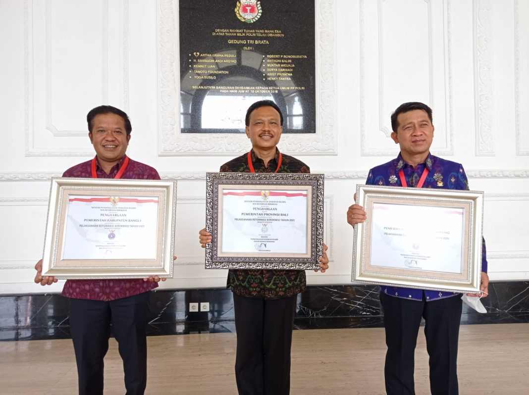 DENPASAR, The East Indonesia – Pemerintah Provinsi Bali berhasil meraih predikat BB pada penilaian pelaksanaan Reformasi Birokrasi (RB) Tahun 2021. Capaian ini mengukuhkan Bali menjadi satu-satunya provinsi yang berhasil naik tingkat dalam penilaian RB yaitu dari B pada tahun 2020 menjadi BB di tahun 2021. Sementara dalam penilaian Sistem Akuntabilitas Kinerja Instansi Pemerintah (SAKIP), Pemprov Bali mempertahankan predikat BB. Perhargaan atas capaian itu diterima oleh Gubernur Bali yang diwakili Sekretaris Daerah Provinsi Bali Dewa Made Indra pada acara penyerahan hasil evaluasi akuntabilitas kinerja dan pelaksanaan reformasi birokrasi yang berlangsung secara offline di The Tribrata Darmawangsa Jakarta, Selasa (5/4/2022).