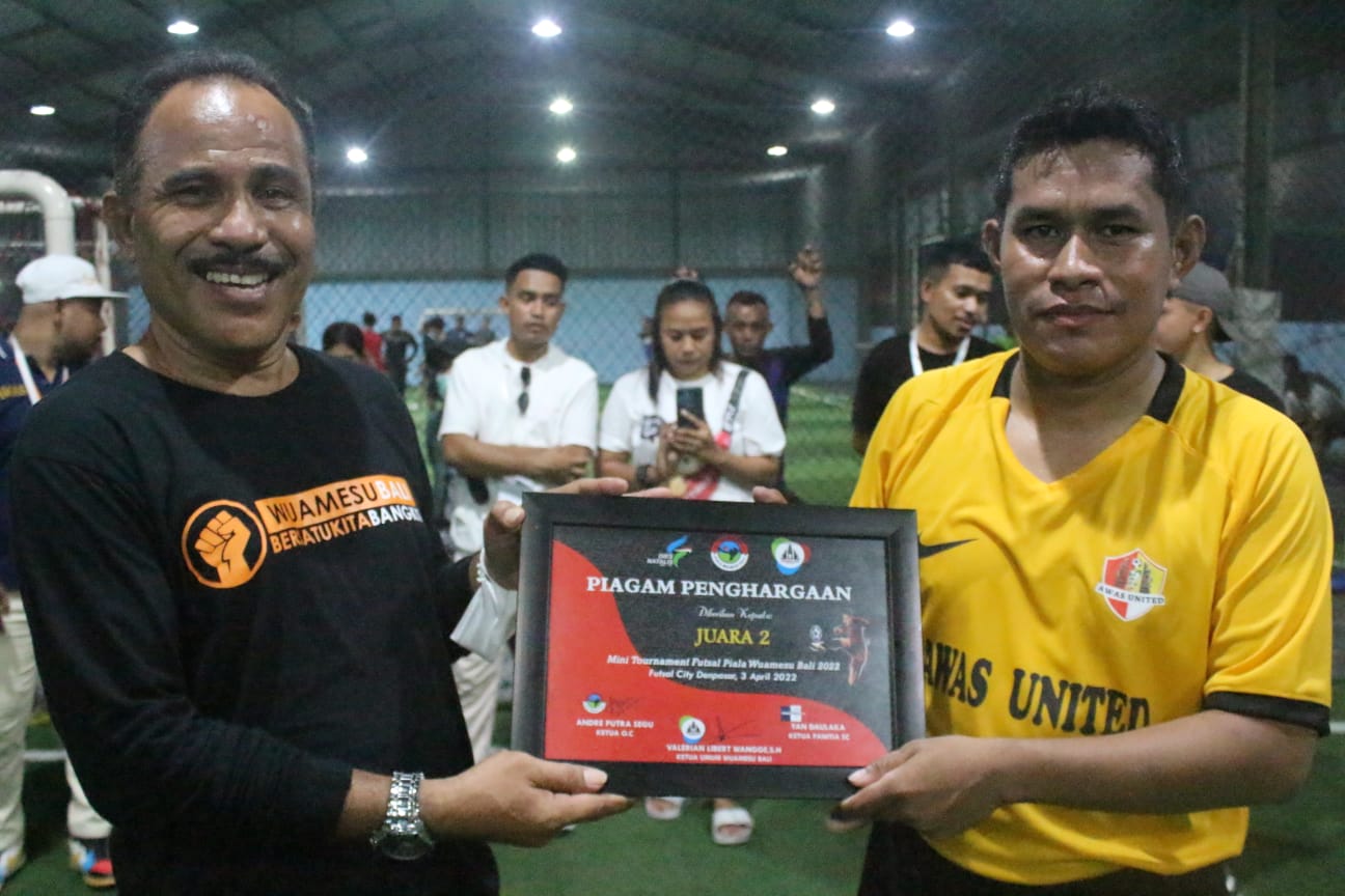 DENPASAR, The East Indonesia – Paguyuban diaspora warga Ende di Bali dibawa bendera Ikatan Keluarga Besar (IKB) Wuamesu Bali baru-baru ini sukses menggelar hajatan Mini Turnamen Futsal Piala Wuamesu Bali 2022. Turnamen yang berlangsung, Minggu (3/4/2022) di City Futsal, Jalan Teuku Umar, Denpasar tersebut mentabiskan Anbass Futsal Club Denpasar sebagai pemenang laga final usai mengkandaskan Awas United. Anbass FC unggul adu pinalti dengan skor 5-4.