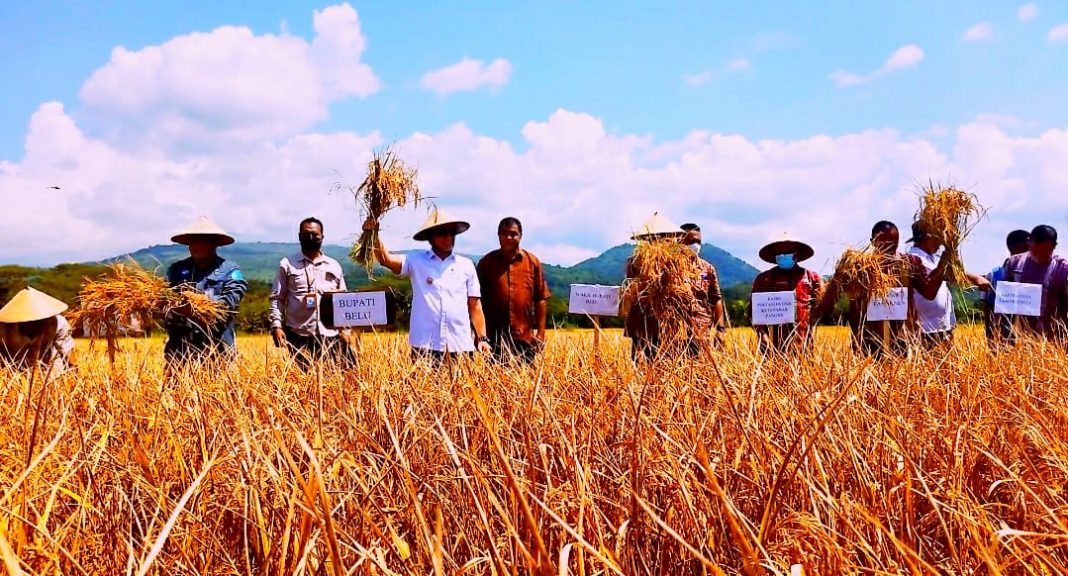 ATAMBUA, The East Indonesia – Bupati, dr. Agustinus Taolin, SpPD-KGEH., FINASIM dan Wakil Bupati, Drs. Aloysius Haleserens, MM mengikuti acara panen perdana Padi di Desa Lamaksenulu, Kecamatan Lamaknen, Kabupaten Belu, Kamis siang (28/04/2022).