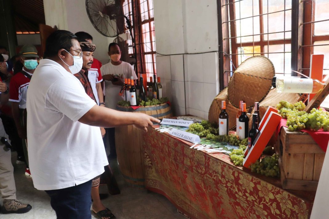 SINGARAJA, The East Indonesia – Berkesempatan mencicipi hasil bumi yang dipamerkan di acara Puncak Peringatan Bulan Bhakti Gotong Royong 2022 di Balai Serbaguna Desa Sanggalangit, Bupati Buleleng Putu Agus Suradnyana memuji para petani buah Desa Sanggalangit karena menggunakan Eco Enzyme sebagai pupuk tanaman buahnya.