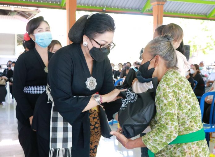 BALI, The East Indonesia – Manggala Utama PAKIS Bali, Ny. Putri Koster didampingi oleh Kepala Dinas Pemajuan Masyarakat Adat (PMA) Provinsi Bali, IGAK Kartika Jaya Seputra memberikan bantuan  100 paket sembako kepada masyarakat miskin, lansia, ibu hamil, disabilitas, pecalang, yowana dan balita di lingkungan Desa Adat Poh Gading, Selasa, 31 Mei 2022.