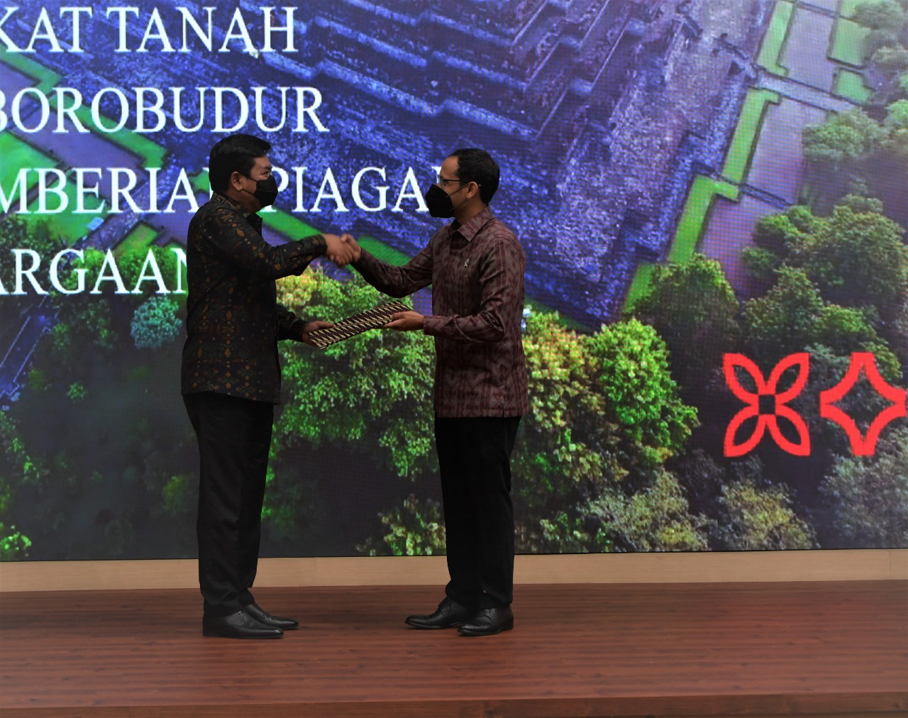Serah terima sertifikat tanah Candi Borobudur juga disertai pemberian piagam penghargaan di bidang pelindungan cagar budaya oleh Mendikbudristek kepada Kejaksaan RI dan Kementerian ATR/BPN sebagai apresiasi Kemendikbudristek atas bantuan dan keberhasilan dalam penyertifikatan tanah Candi Borobudur.