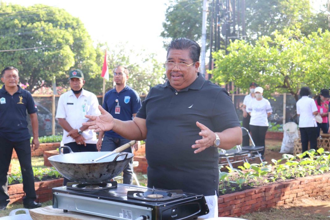 Bupati Buleleng Putu Agus Suradnyana memantau langsung dan berkesempatan memanen sayuran-sayuran yang ditanam di Singaraja Smart Agrocity, Selasa (23/8). Pagi ini, Rabu (24/8) Bupati Suradnyana datang ke Singaraja Smart Agrocity untuk memasak langsung sayur kangkung organik yang baru saja dipanen.