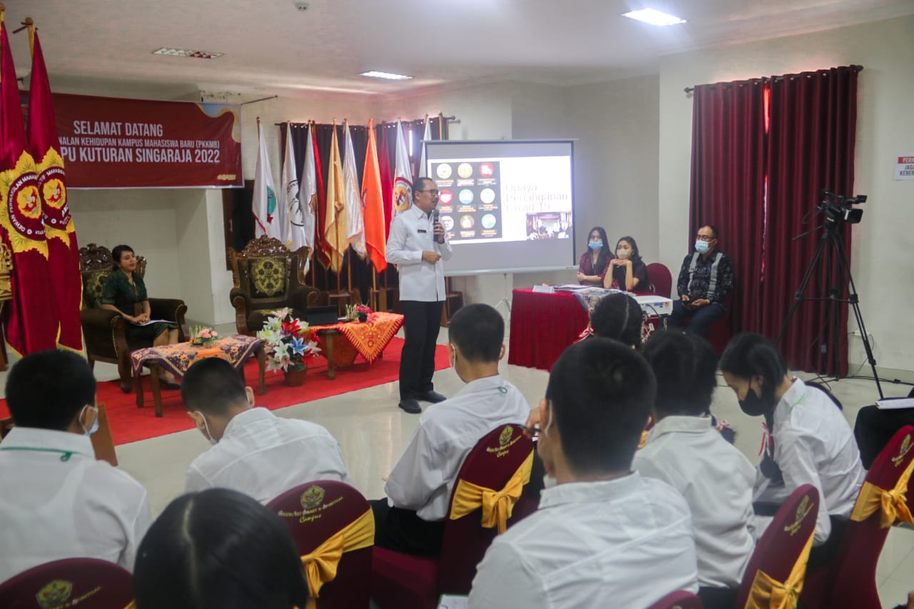 SINGARAJA, The East Indonesia – Sekretaris Daerah (Sekda) Kabupaten Buleleng Gede Suyasa menjadi narasumber pada kegiatan Pengenalan Kehidupan Kampus Mahasiswa Baru (PKKMB) 2022 Sekolah Tinggi Agama Hindu Negeri (STAHN) Mpu Kuturan.