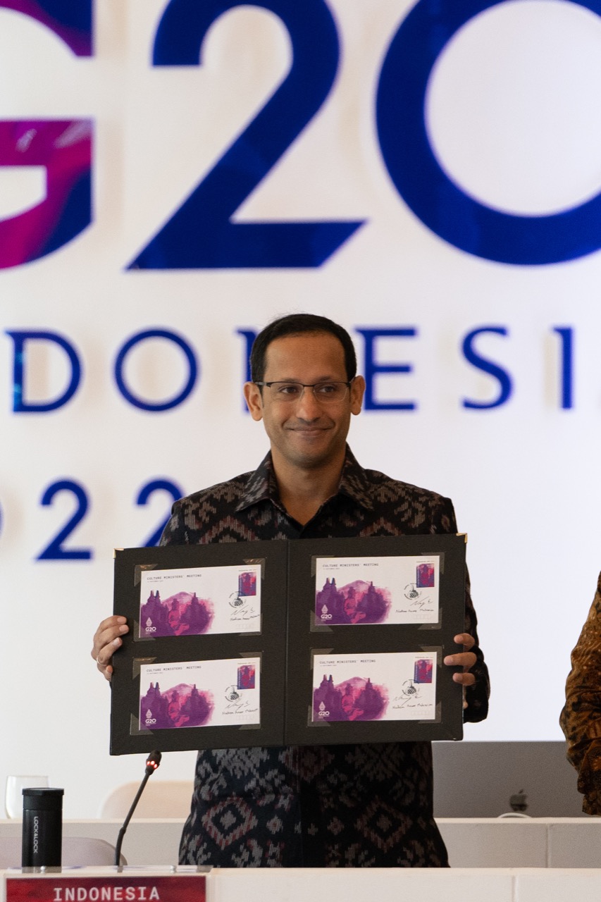MAGELANG, The East Indonesia – Kementerian Pendidikan, Budaya, Riset, dan Teknologi (Kemendikbudristek) bersama dengan Direktorat Jenderal Penyelenggaraan Pos dan Informatika, Kementerian Komunikasi dan Informatika (Kemenkominfo) menerbitkan prangko dan sampul peringatan G20 Culture Ministers’ Meeting yang ditandatangani oleh Mendikbudristek, Nadiem Anwar Makarim. Peristiwa ini merupakan bagian dari Pertemuan Tingkat Menteri G20 bidang Kebudayaan yang diselenggarakan di Kawasan Candi Borobudur, Jawa Tengah pada Selasa (13/9).