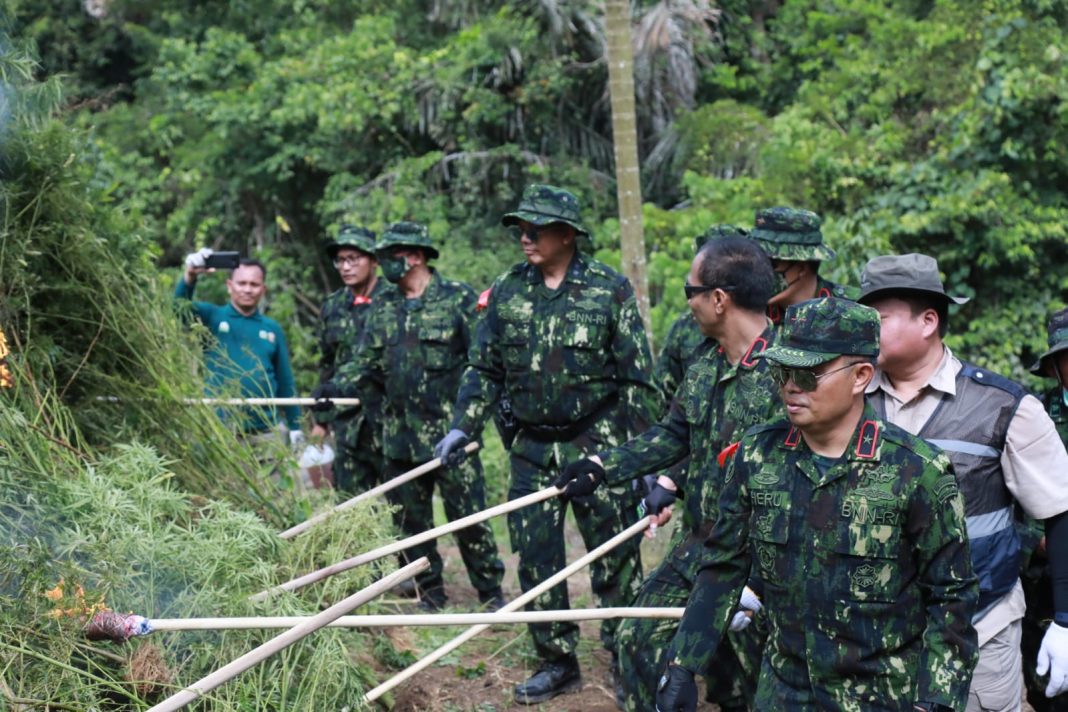 ACEH BESAR, The East Indonesia – Semangat perang melawan narkoba “War On Drugs” terus digelorakan Badan Narkotika Nasional Republik Indonesia (BNN RI). Bersama tujuh Jenderal, BNN RI mengajak seluruh masyarakat untuk turut menolak peredaran gelap narkoba melalui Pemusnahan Ladang ganja di Kecamatan Indrapuri Kabupaten Aceh Besar, Provinsi Aceh, Kamis (29/9).