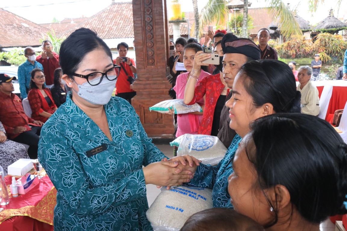 “Tiang mesadu ajeng dengan Bapak/Ibu, sambil tiang berbagi membawa kebutuhan pokok yang sangat diperlukan oleh kita semua. Paling tidak, ketika kita berbagi dengan kebutuhan pokok, Bapak/Ibu bisa berhemat tidak berpikir lagi dalam sebulan ini untuk mencari tambahan penghasilan, tambahan untuk kebutuhan pokok keluarga,” ucap Ny. Putri Suastini Koster.