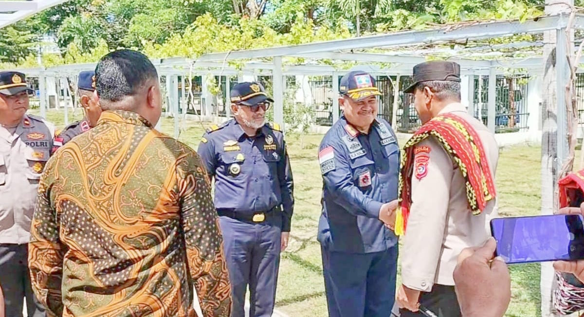 Kepala Kantor Imigrasi Atambua, KA Halim saat menyambut Kapolda NTT, Irjen Pol Johni Asadoma di PLBN Motaain sebelum berangkat ke Dili, Timor Leste. FOTO – IST.