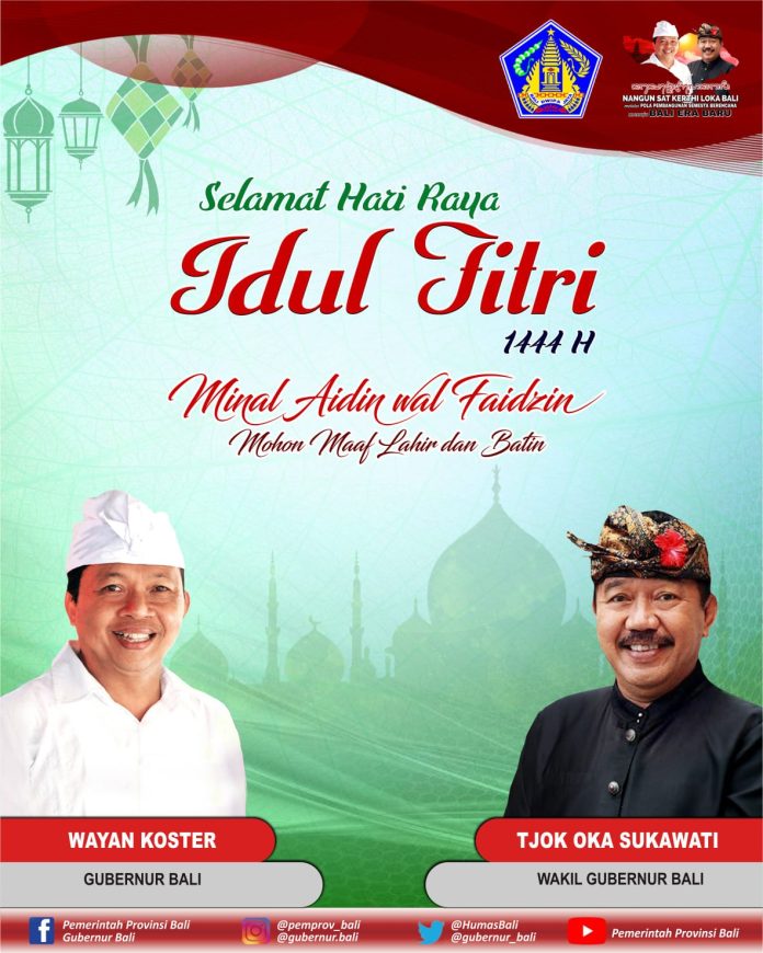 NasionalSosial Gubernur dan Wakil Gubernur Bali Mengucapkan Selamat Hari Raya Idul Fitri 1444 H 18-04-2023 410 Facebook Twitter Pinterest WhatsApp FOTO - Gubernur dan Wakil Gubernur Bali Mengucapkan Selamat Hari Raya Idul Fitri 1444 H Tanggal 22 - 23 April 2023