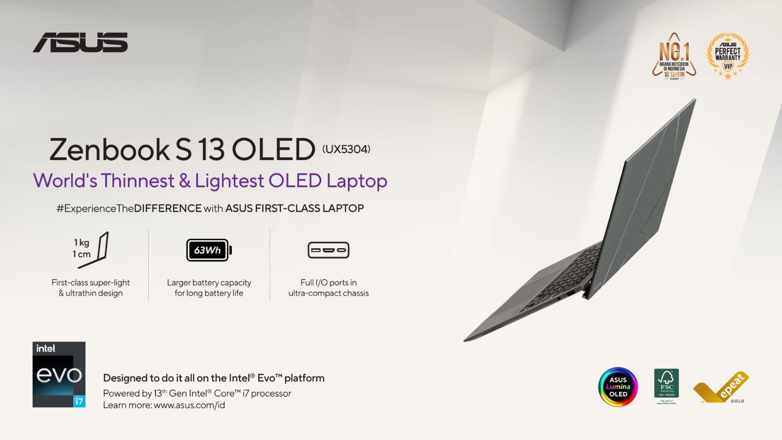 - Stylish, Tipis, dan Ringan: Memiliki ketebalan hanya 1 cm dan bobot 1 kg, membuat ASUS Zenbook S 13 OLED tampil sebagai laptop OLED 13,3-inci paling tipis dan ringan di Dunia.