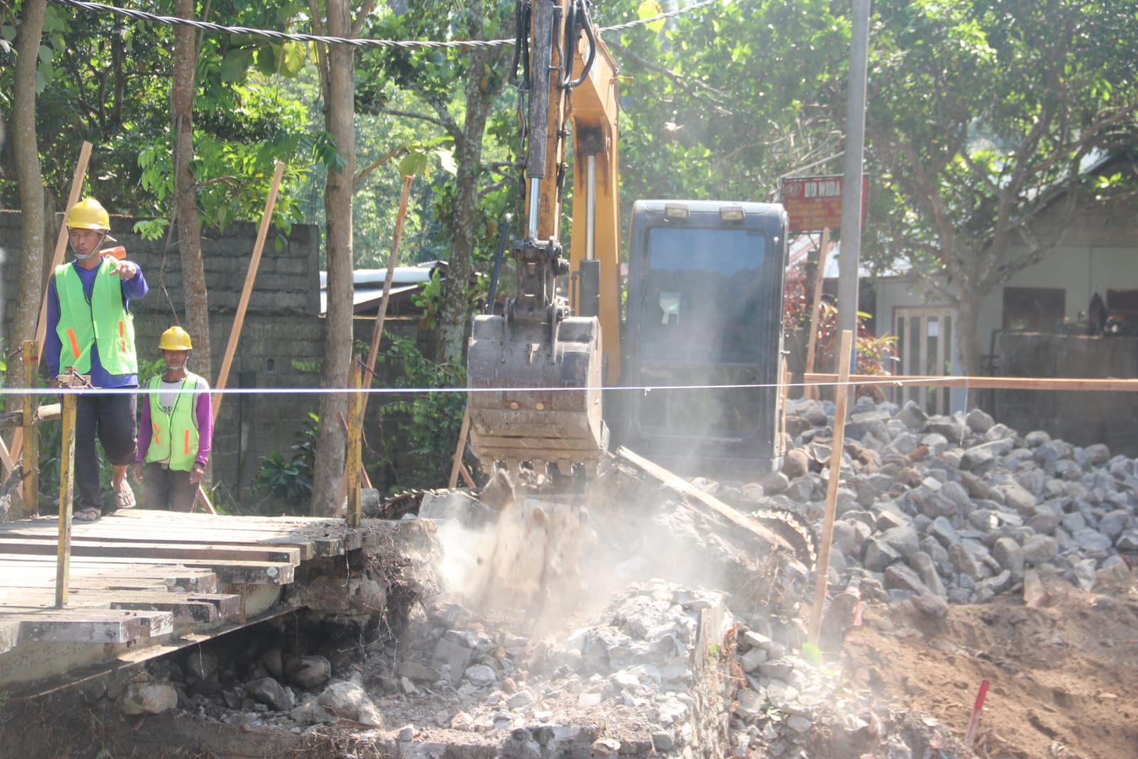 “Nahh karena itulah pemerintah desa dan masyarakat bergotong royong dan berinsiatif untuk membuat jembatan darurat menggunakan sarana prasarana yang ada sebelum dilakukan perbaikan dari pemerintah agar mobilitas masyarakat bisa tetap berjalan,” ujarnya.