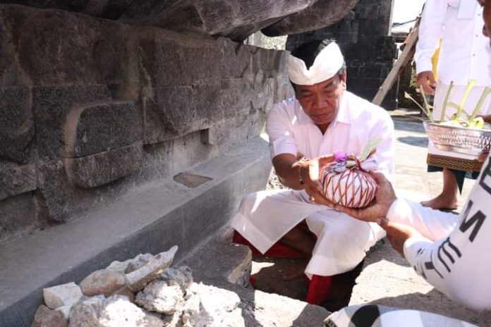 SINGARAJA, The East Indonesia – Penjabat (Pj) Bupati Buleleng Ketut Lihadnyana didampingi Sekretaris Daerah Gede Suyasa menghadiri persembahyangan bersama pada Upacara Mupuk Pedagingan lan Melaspas serangkaian Piodalan Pura Agung Jagatnatha, Minggu (25/6).