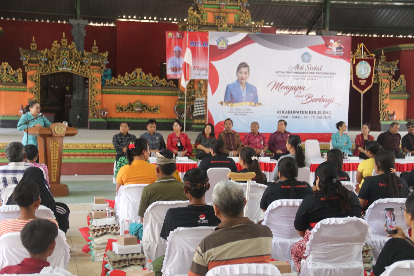 Aksi sosial ini dirangkaikan dengan penyerahan bantuan berupa sembako dan makanan tambahan (susu formula) kepada lansia, ibu hamil, penyandang disabilitas, Kader PKK, dan balita termasuk bibit pohon, bibit ayam beserta pakannya dan alat kesehatan yang diserahkan langsung oleh Ketua TP PKK Provinsi Bali Ny. Putri Koster bertempat di Wantilan Kerta Locitta Desa Banjar, Kecamatan Banjar, Sabtu (15/7).