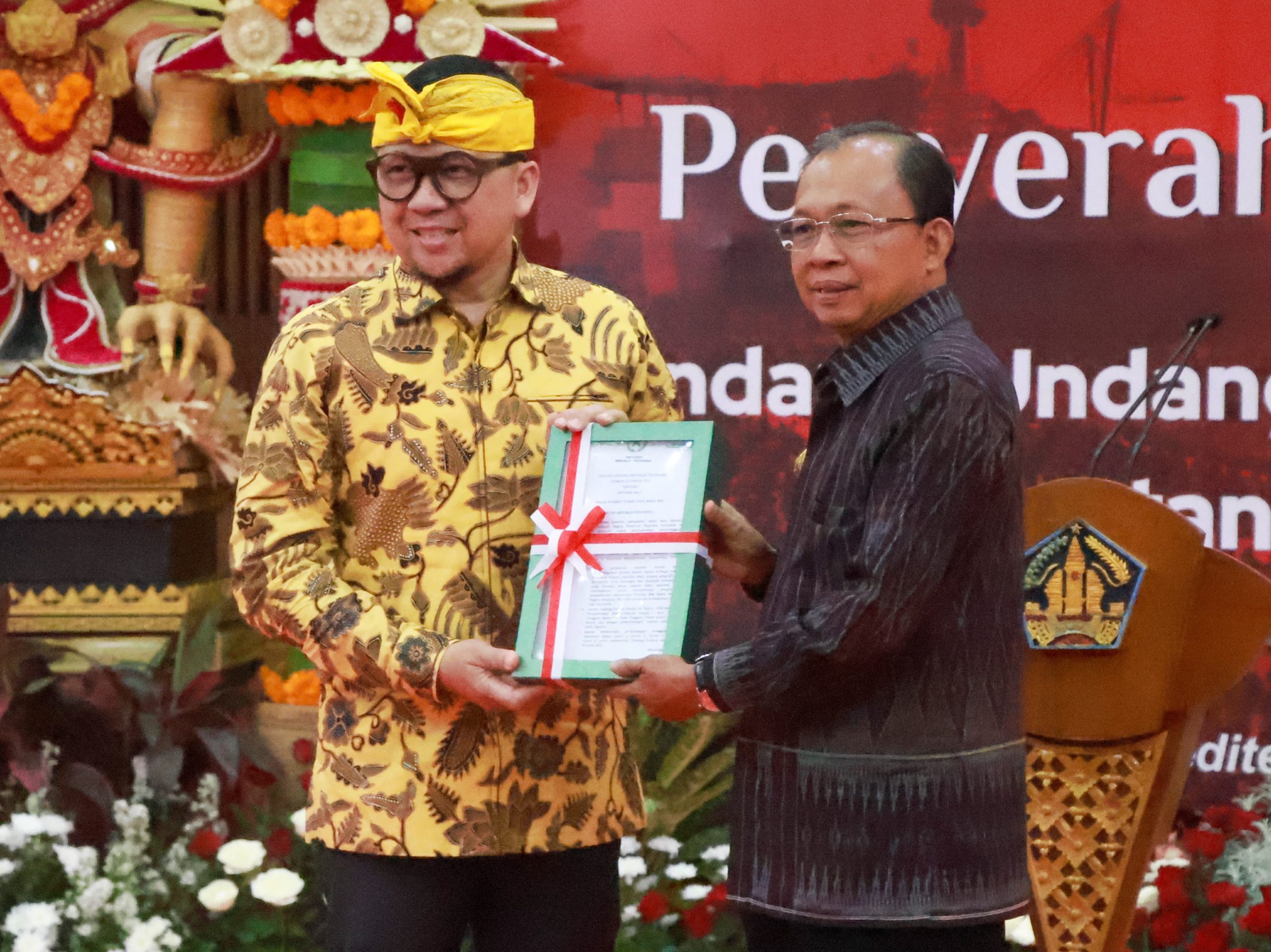DENPASAR, The East Indonesia – Gubernur Bali, Wayan Koster menerima dokumen Undang – Undang Nomor 15 Tahun 2023 tentang Provinsi Bali dari Ketua Komisi II DPR RI, Bapak Ahmad Doli Kurnia Tanjung pada, Minggu, (23/7) di Gedung Wiswa Sabha Utama, Kantor Gubernur Bali.