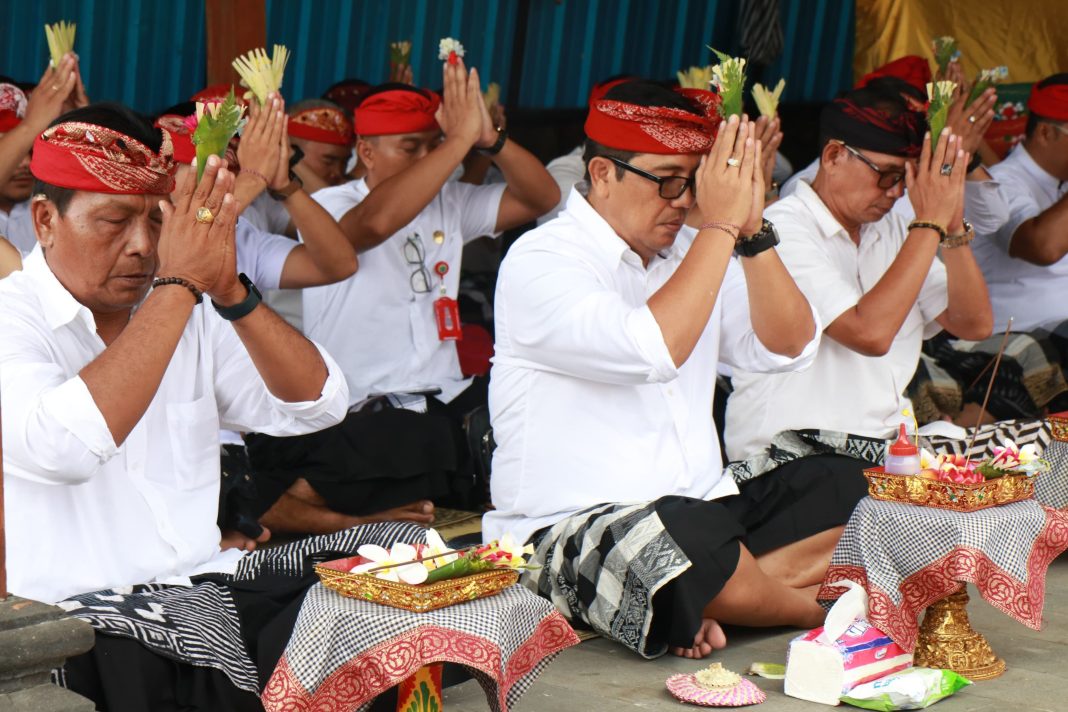 TABANAN, The East Indonesia – Bupati Tabanan Dr. I Komang Gede Sanjaya, SE, MM, bersama jajaran melaksanakan persembahyangan bersama Pujawali Ida Bhatara Kahyangan Jagat Pura Luhur Muncak Sari, Desa Sangketan, dilanjutkan meninjau dampak bencana cuaca ekstrim di Pura Luhur Batukau Desa Wongaya Gede, Penebel, Tabanan, Jumat, (22/3).