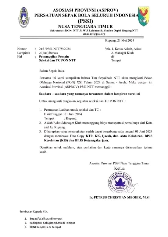 Pemanggilan 29 pesepakbola ini diumumkan langsung oleh Asprov PSSI NTT yang diketahui oleh Ketua Asprov PSSI NTT, Ir. Petrus Christian Mboeik, M.Si melalui surat tertanggal 21 Mei 2024.