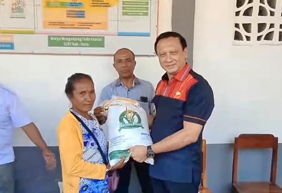 ATAMBUA, The East Indonesia – Bupati Belu, dokter Agustinus Taolin, SpPD-KGEH, FINASIM menyerahkan bantuan Beras Cadangan Pangan Pemerintah (CPP) kepada masyarakat di Kantor Desa Kabuna, Kecamatan Kakuluk Mesak, pada Rabu, 19 Juni 2024.