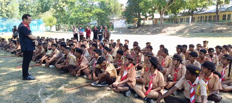 ATAMBUA, The East Indonesia – Bupati Belu, dokter Agustinus Taolin SpPD-KGEH, FINASIM meninjau latihan gabungan Gugus Depan (Gudep) Pramuka Belu di Markas Kompi Senapan B Batalyon Infantri (Yonif) 744/SYB di Desa Manleten, Kecamatan Tasifeto Timur, Kabupaten Belu, Rabu (19/06/2024).