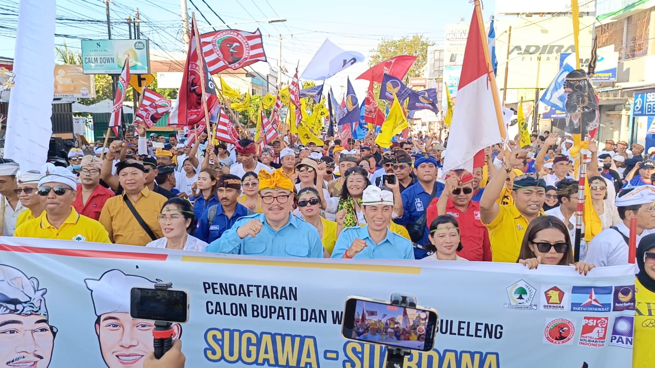 SINGARAJA, The East Indonesia – Paket Nyoman Sugawa Korry berpasangan dengan Gede Suardana mendaftar ke KPU Buleleng dengan diantar ribuan massa pendukung. Paket yang diusung Golkar, Demokrat, Gerindra, Nasdem dan didukung Partai PAN serta PSI ini merupakan paket bacalon Bupati dan Wakil Bupati yang kedua mendaftar ke KPU Buleleng.