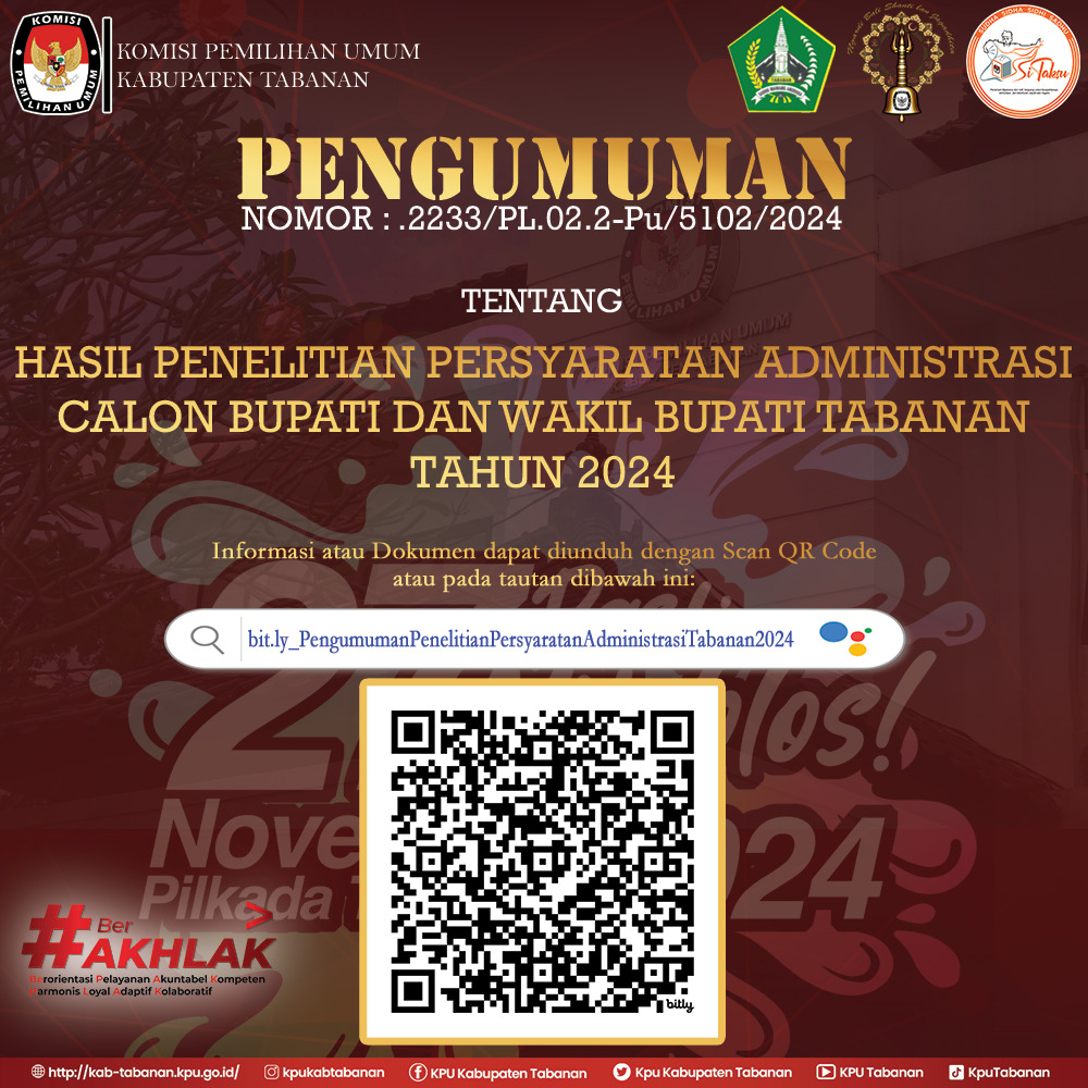 TABANAN, TheEastIndonesia – Pengumuman KPU Tabanan Tentang Hasil Penelitian Persyaratan Administrasi Calon Bupati dan Wakil Bupati Tabanan Tahun 2024.***